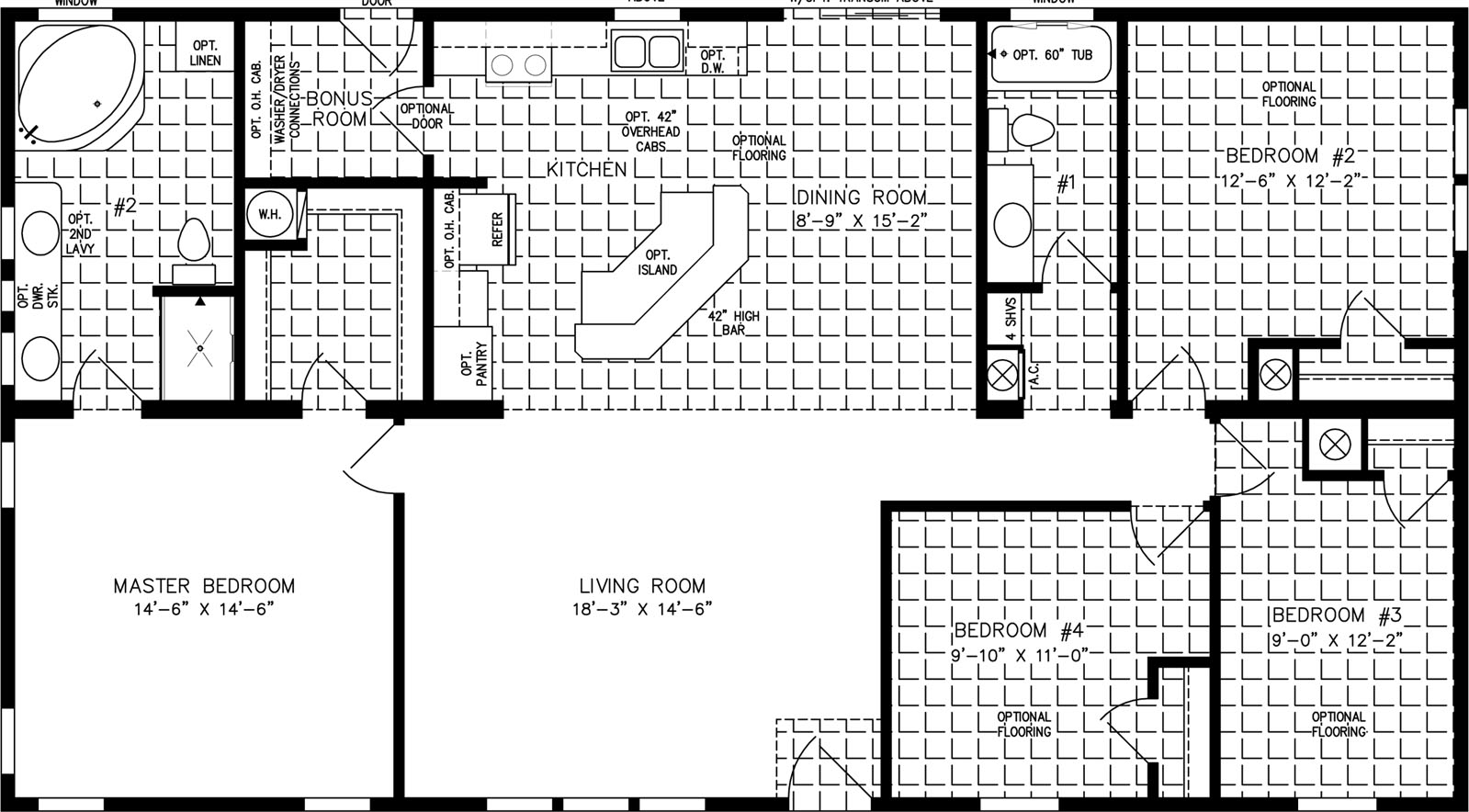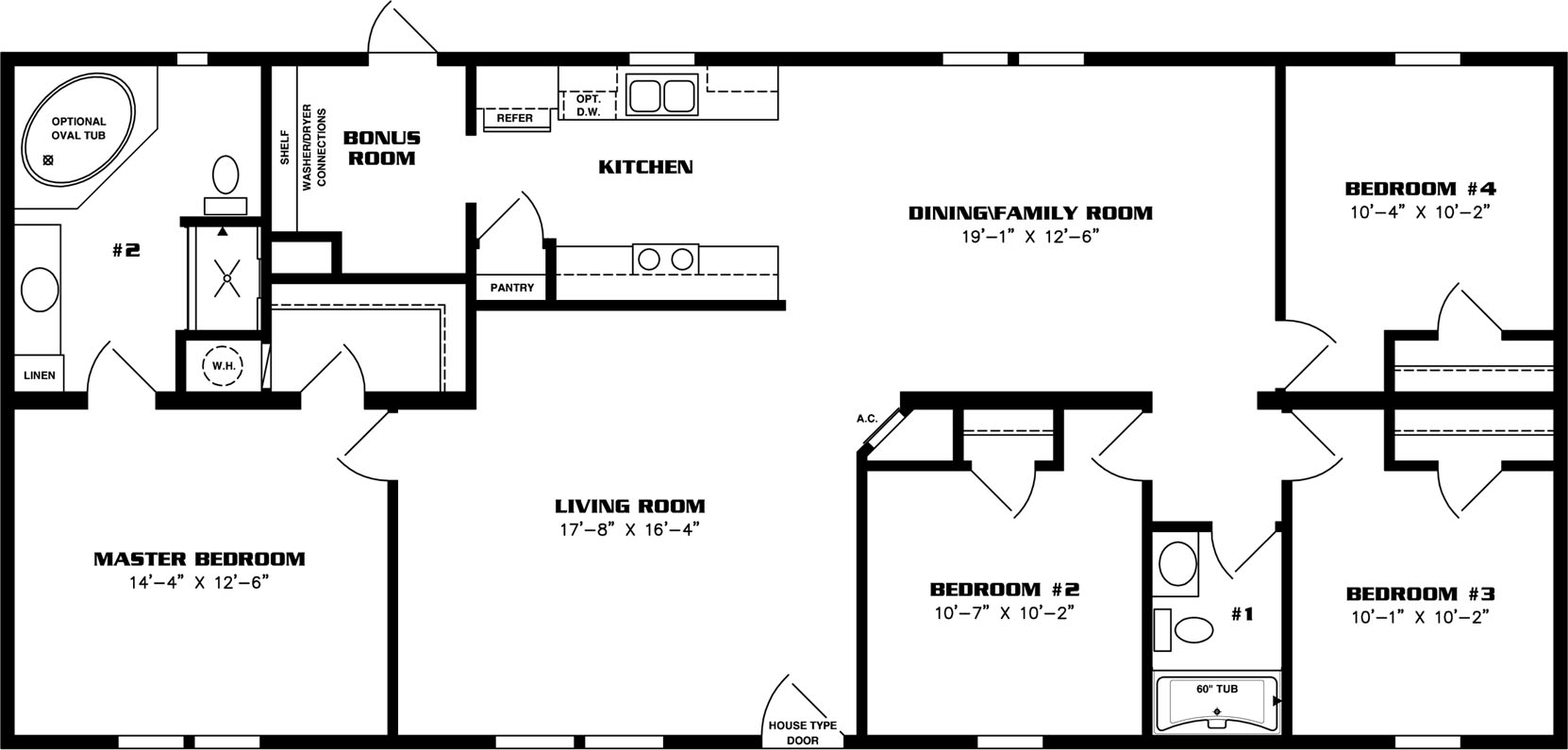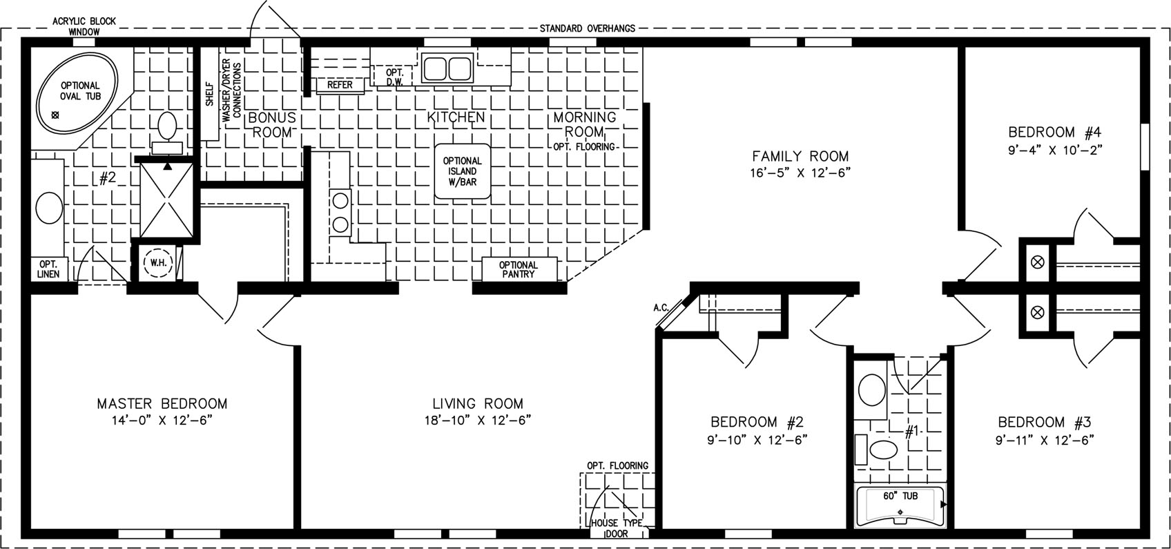 With four bedrooms, two full bathrooms, and an expansive dual living and dining space, the IMP-46019B prioritizes entertaining and common areas. A small kitchen and bonus laundry room round out the 1,600 square foot home, which maintains a simple but elegant design throughout. Those looking for a little more space for kitchen prep can opt for an alternative kitchen layout that has an optional island and a 42” high bar with columns.