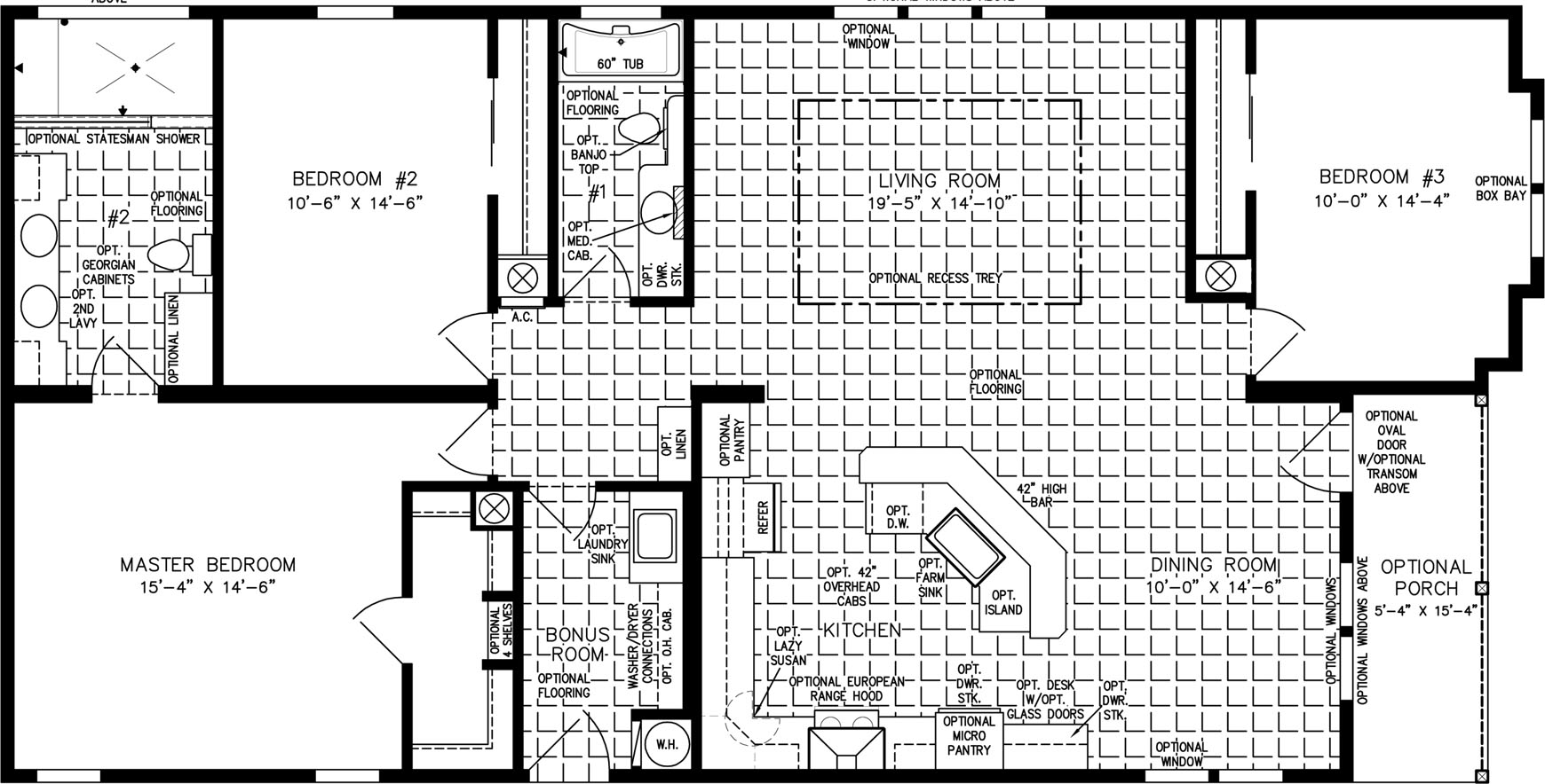 Perhaps the most enviable features of the IMP-4623B-525 double wide modular home is its sun-drenched family room. Boasting four large panel windows and two optional corner bays, this room is filled with natural light year-round. Perfect for hosting, this family room can be upgraded to include a 42” high bar, a full-service wet bar, and built-in credenza. Rounding out the home’s 1,653 square feet are three bedrooms, two full baths, a large kitchen and dining area, and a spacious living room.