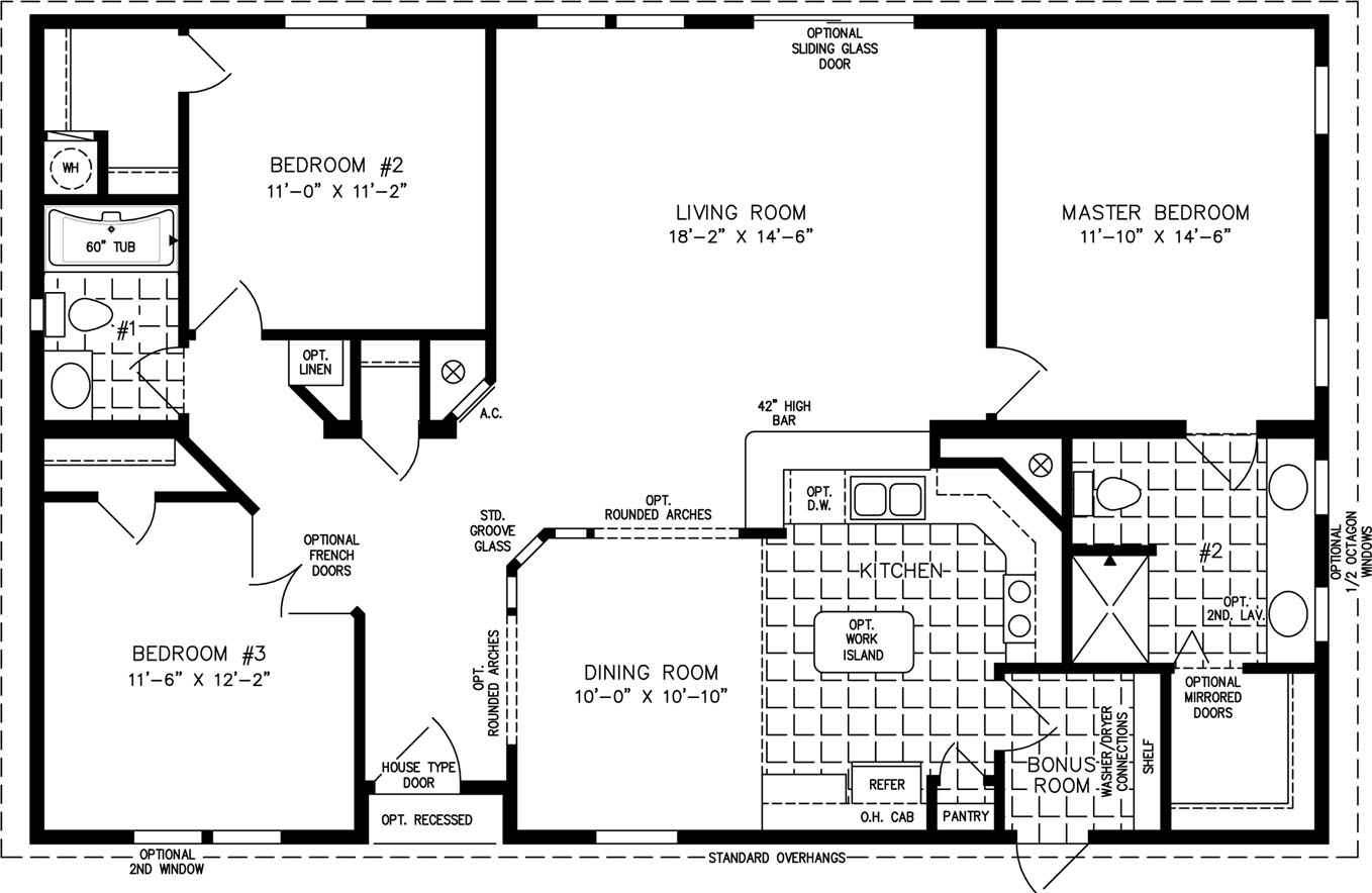 The optional front porch on our IMP-6502B double wide manufactured home model offers owners the opportunity to create a welcoming, traditional entryway. From there, the home opens up into a large dining room and living room area, made larger by an open-concept floor plan design. The 44” high bar creates additional seating and entertainment space, separating the kitchen from the rest of the home. With three bedrooms and two full baths, this model is well-equipped for families, couples, or retirees.