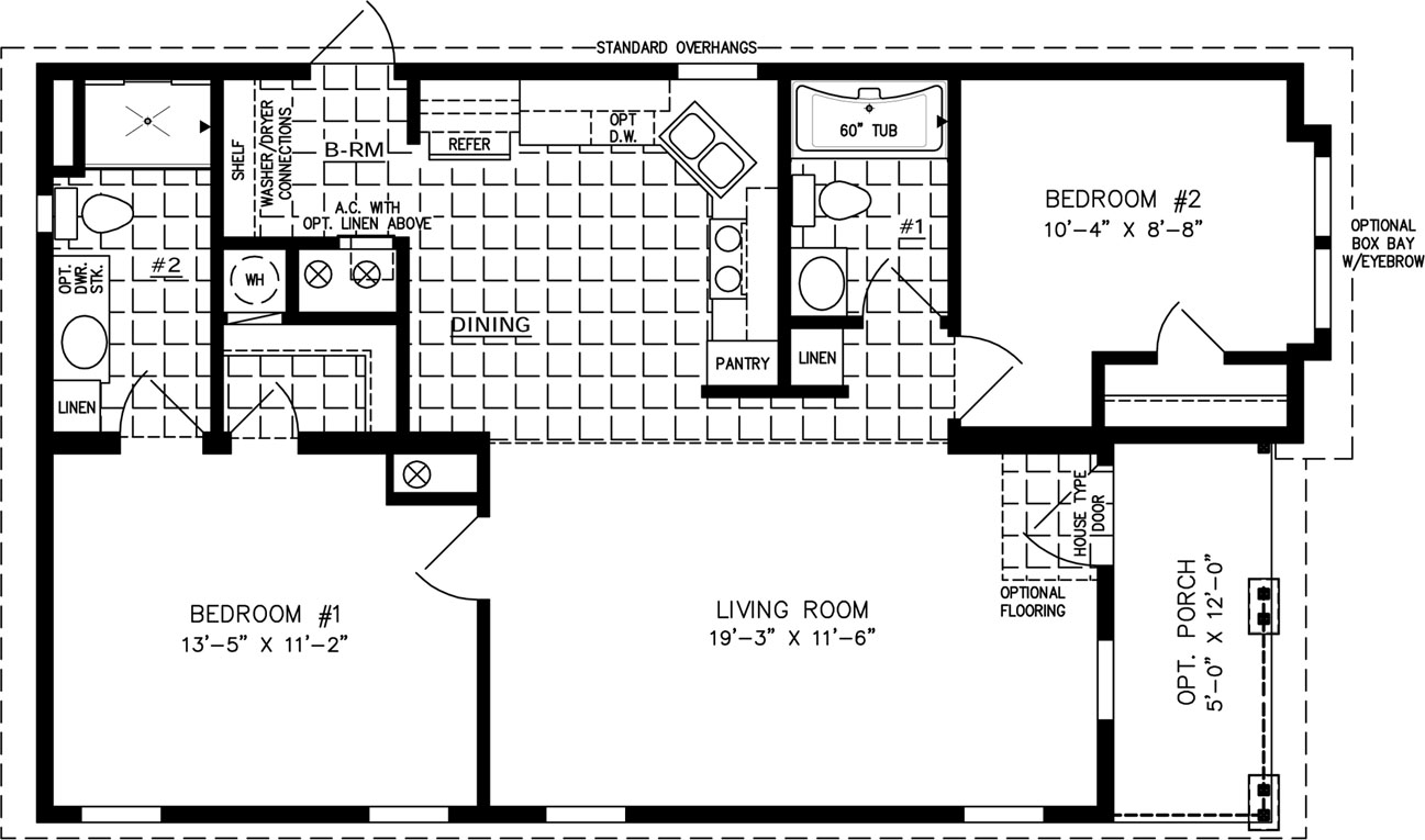 Thoughtfully designed to make the most of its 888 square feet of space, the Imperial IMP-6402A double wide manufactured home is still equipped with the accouterments of a luxury home. This two bedroom, two bathroom home can be upgraded with an optional porch for those who want to spend quiet mornings outside. The large 19’ 3” x 11’ 6” living room flows unimpeded into the dining and kitchen areas, optimizing your space for entertaining.