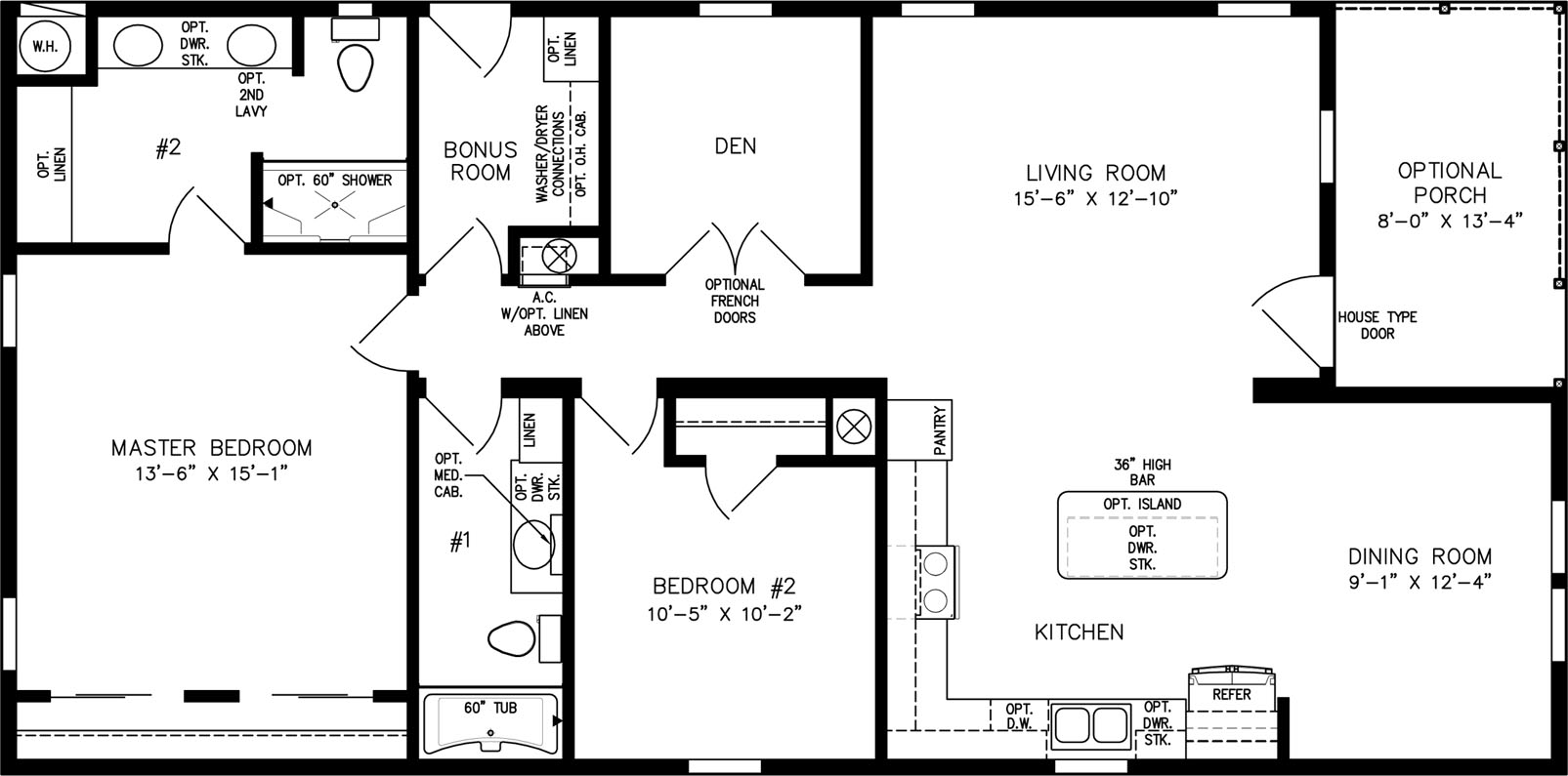 Boasting an optional 8’ 0” x 13’ 4” covered porch, the Imperial IMP-6541B-37066 double wide manufactured home brings all of the accouterments of standard site build homes into a charming 1,334 square foot package. This two bedroom, two full bathroom model also features a small den that can function as anything from a home office or a kids’ playroom to a storage area or crafting space. The extensive outdoor optional porch is perfect for protecting your vehicle from rain, with a side door entrance into the home for easier access in unfavorable weather.