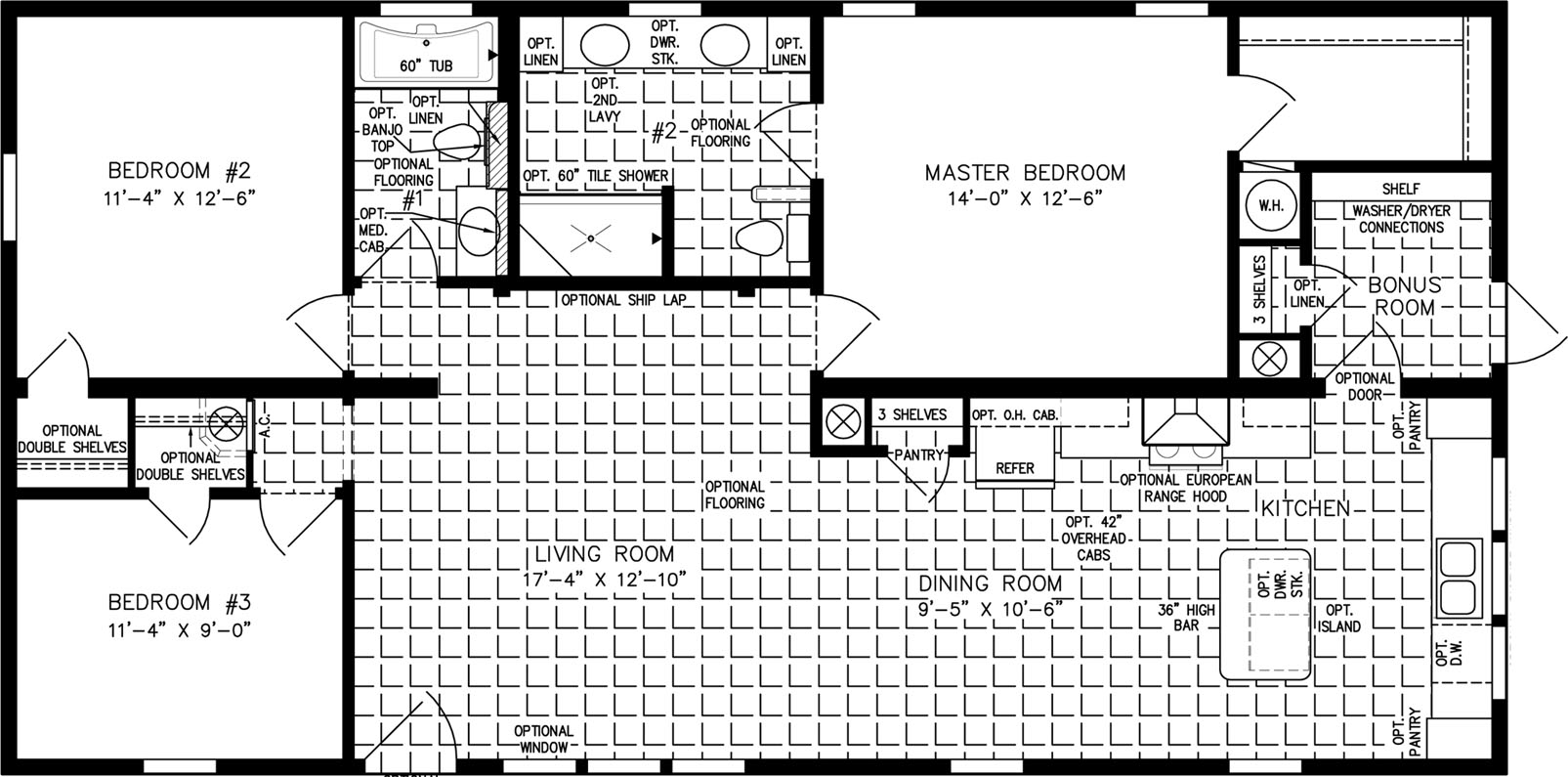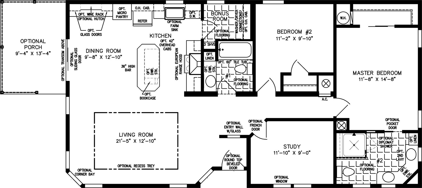 Crafted to maximize the available space on your property, our TNR-5501B-36359 model is shown elevated enough to allow car parking beneath, the home is accessed through a charming set of stairs located on its side. This model, which has two bedrooms, two full bathrooms, and a bonus study, also has an optional add-on optional front porch that’s perfect for bird watching or drinking coffee on cool summer mornings. At 1,351 square feet, this double wide manufactured home is capable of meeting a variety of lifestyle needs.