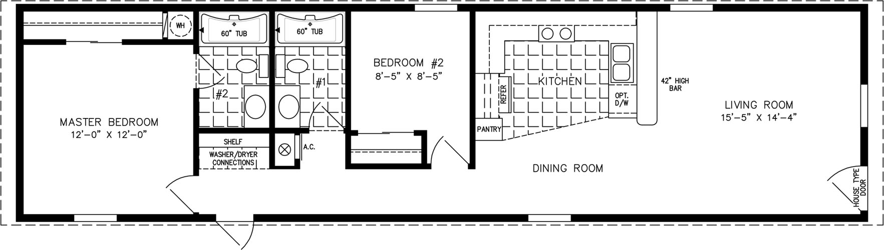 A single wide manufactured home with a luxury feel, our Imperial ISWW-1601 model clocks in at 920 square feet. With two bedrooms, two full baths, and even a sectioned off laundry room, this little model is able to give owners the organization and space they need to live comfortably. A long high bar separates the kitchen from the living room, providing additional seating options for entertaining guests.