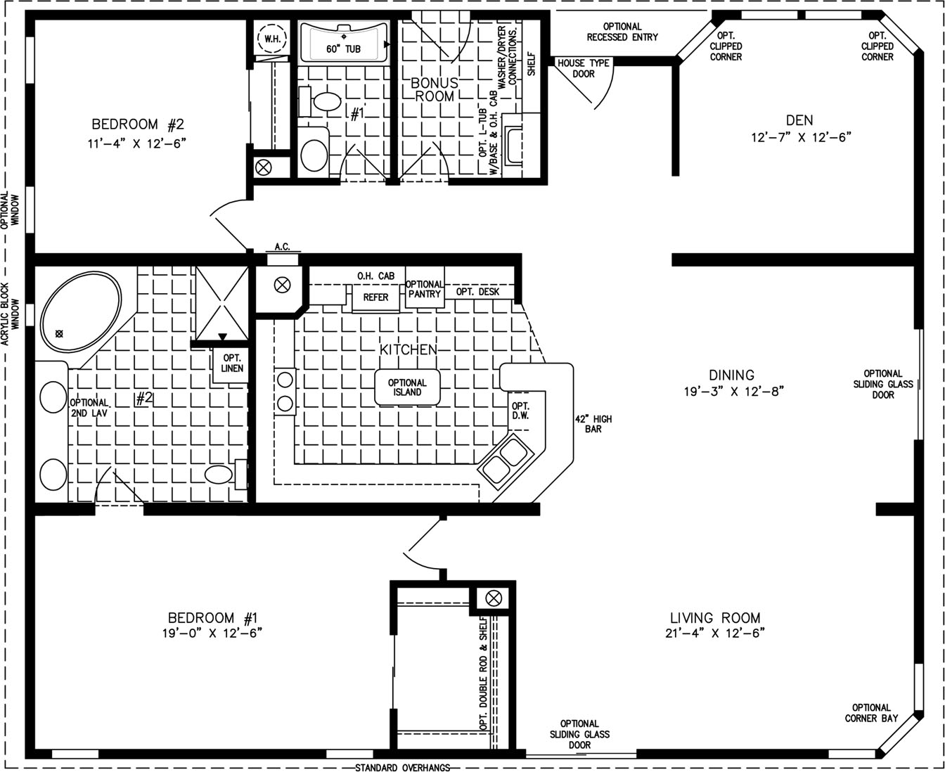 Those who appreciate designated, distinctive home spaces with multiple functionalities will love the layout of our TNR-7482 manufactured home. Featuring an elongated, extensive 19’ 0” x 12’ 6” master bedroom with walk-in closet and ensuite bathroom, this 1,920-square-foot home is well-suited to a variety of owners. The 12’ 7” x 12’ 6” den can be utilized as a kids’ playroom, craft space, home office, or extra bedroom. Optional upgrades such as corner bay windows and sliding glass doors for the living room create a harmony between indoor and outdoor spaces, while other upgrades like the optional kitchen island add increased storage space.